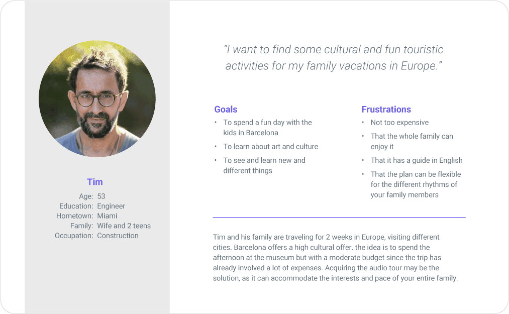 "Tim is a family man on vacation in Barcelona who needs an English audio tour of the museum to enhance his experience. This is because he doesn’t speak the local language or know enough about the subject."